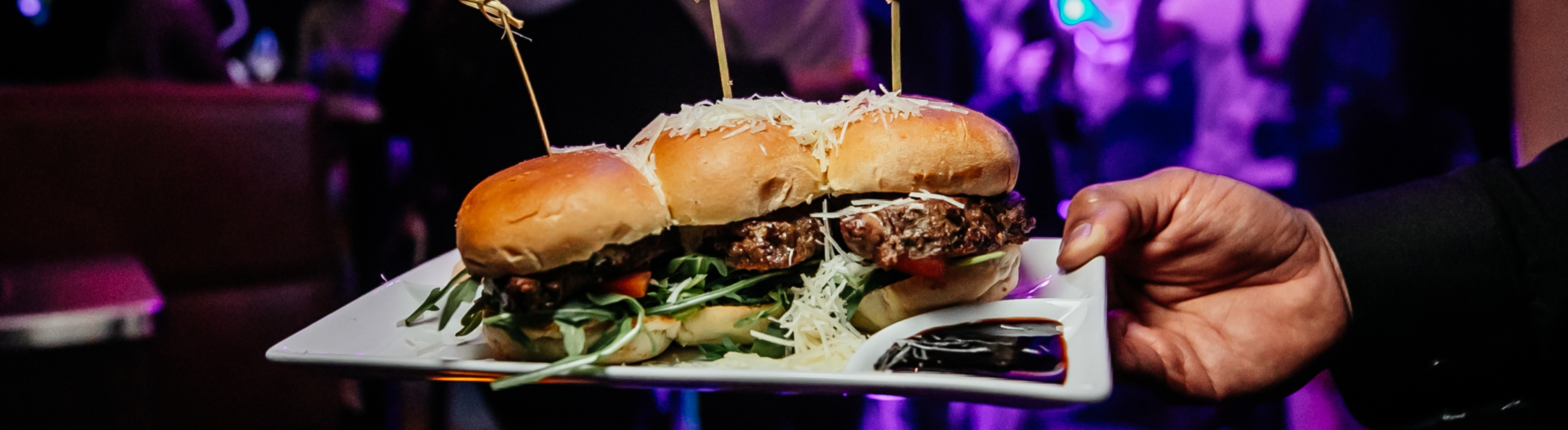 Two Sliders, Truffle Tenderloin, Sliced, Sitting on a Bed of Arugula, Topped with Caramelized Onion, Melty Gruyere and a Truffle Aioli on a Toasted Potato Bun, Served with Potato Sticks